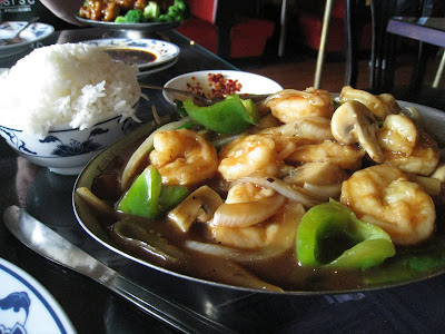 The best meal we ate that week was, without a doubt, at Kong Chow in Shelburne. We were greeted enthusiastically by our awesome server Josh and the owner. We chose a table in the dining room (there's outdoor seating on the patio, too), and were presented with a dish of housemade fried noodles (Josh informed us that nearly everything -- sans soy sauce -- is housemade at Kong Chow), a sweet dipping sauce (similar to duck sauce), a pot of delicious tea, and of course, ice water. We started with an order of the Hot Oil Wontons, which are not fried, but steamed, and come drizzled with chili oil. My guy ordered the Tangerine Chicken, which was spicy, sweet, and perfectly cooked, and I ordered the Black Forest Shrimp.