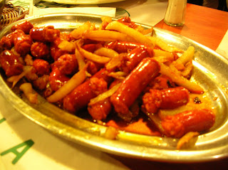 They're famous for their sidra (cider), which they pour into the cups from about a three feet height (to break the cider). Simply put, the food was delicious. We ordered an ensalada mixta -- which came loaded with veggies and oil-packed tuna, chistorra con patatas -- a sausage similar to chorizo in taste but smaller in size and served with french fries, and patatas con juevos revueltos -- literally means potatoes with scrambled eggs, but it's more like potatoes, green peppers, and Serrano ham, with